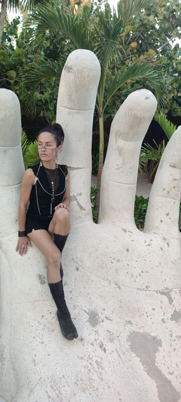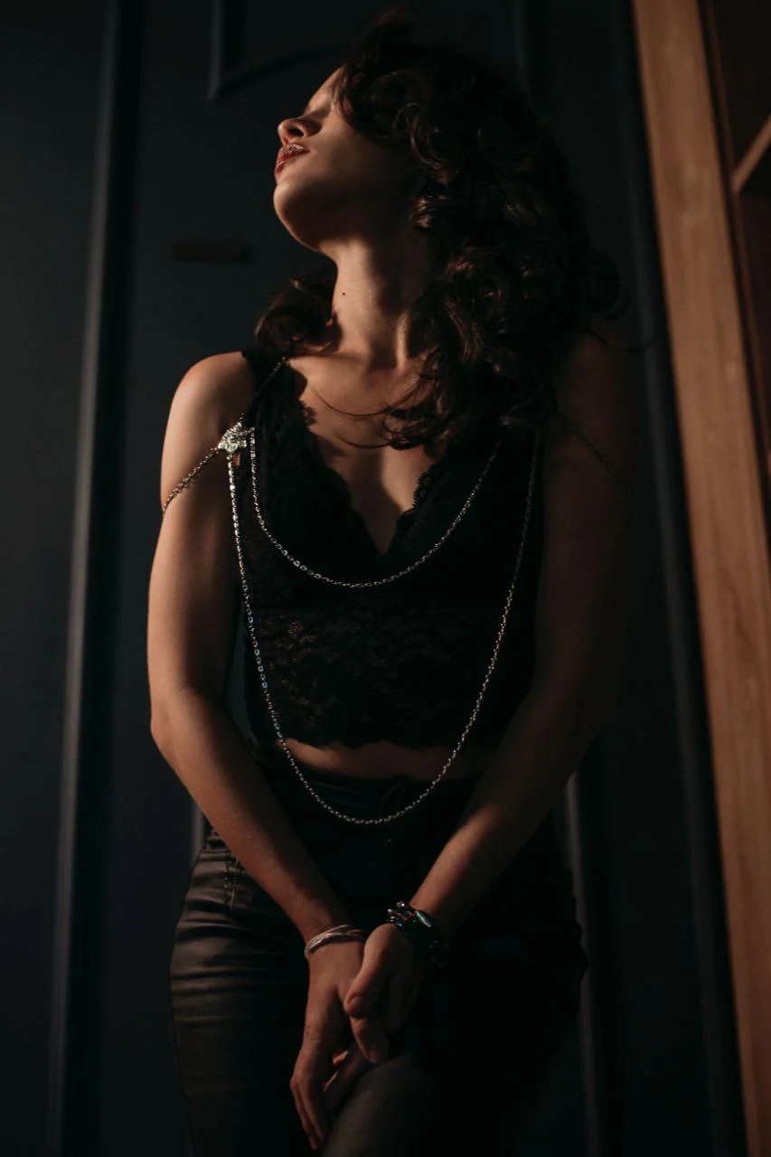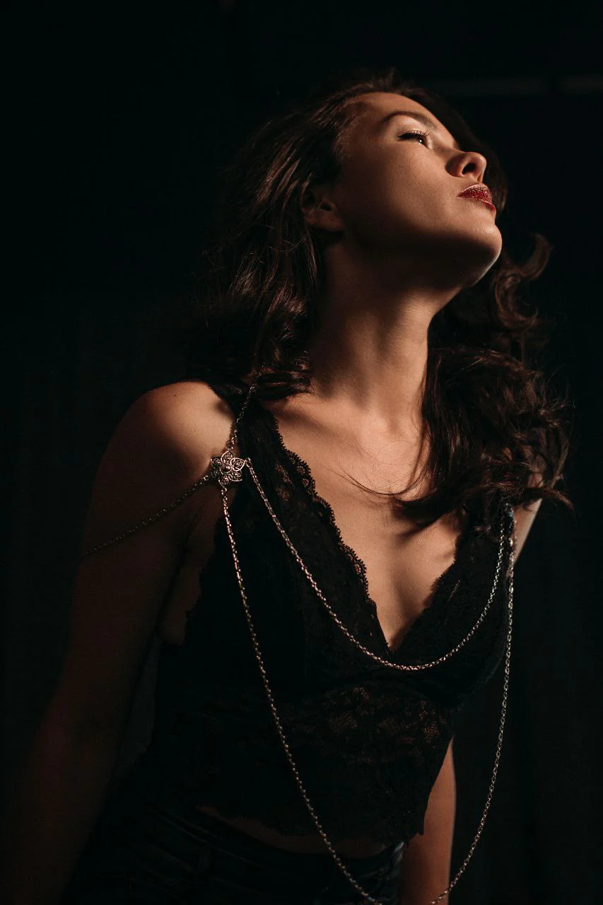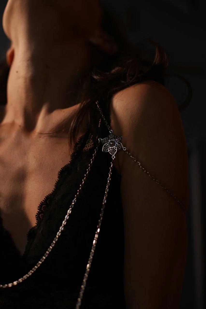 Die zarten Ketten, die den Körper umschmeicheln, erzeugen eine anmutige Bewegung, fesseln den Blick und verströmen eine Aura der Eleganz.